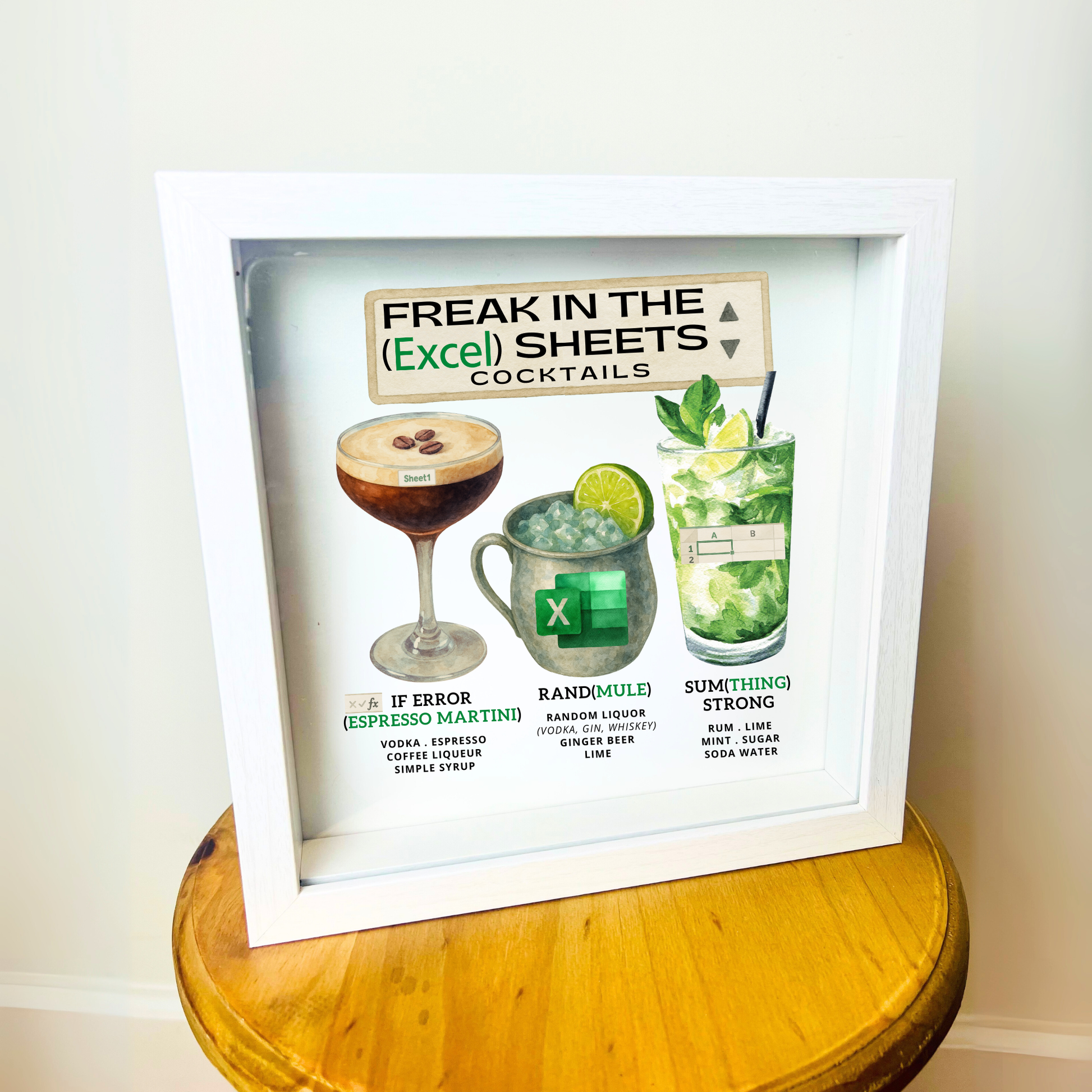 Boozy Boards are a cocktail menu for your home bar or kitchen. When guests come over and ask "What do you have to drink?" you have a pre-made Boozy Board prepared to show off your bartending skills and keep the bar stocked. Boozy Boards are a statement art and conversation piece that will wow your guests. Additionally, Boozy Boards make a unique gift that is personal to the person who has everything. Boozy Boards include the wood & glass shadowbox frame, and the cocktail menu shown.
