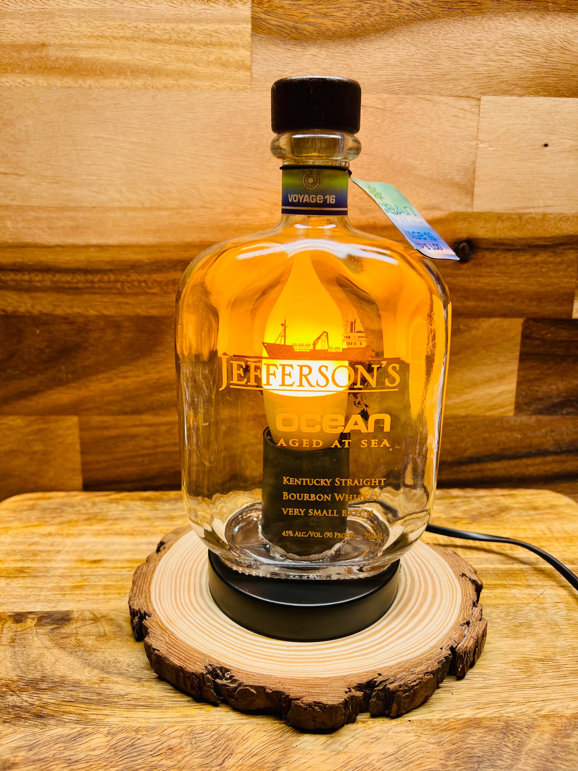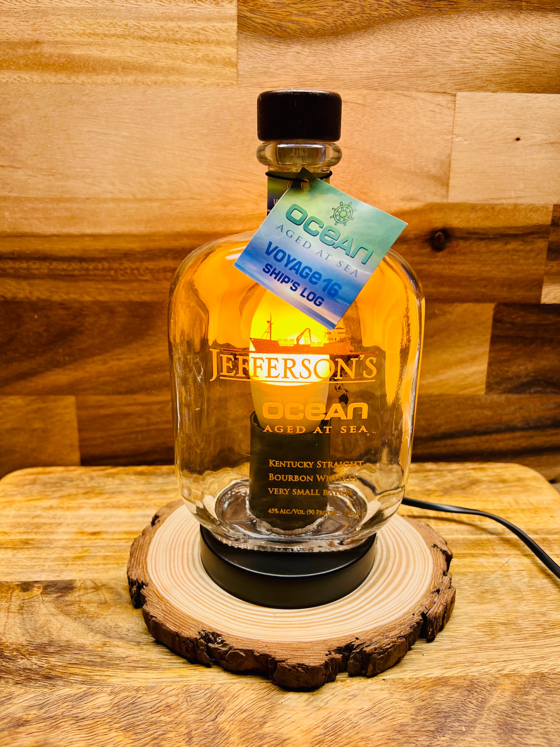 These liquor bottle lamps are handmade out of re-purposed liquor bottle lamps locally here at Boozy Boards. Each bottle lamp is hand drilled using an industrial drill press at the bottom of the bottle for easy removal when the LED light bulb needs to be replaced. In each bottle lamp order, we provide the original box for the LED light bulb for easy replacement purchasing. Additionally, each bottle lamp is made with reclaimed wood bases that are unique to the bottle paired in the photo. Each bottle lamp has 3 settings: continuous on, flicker, and candle light.