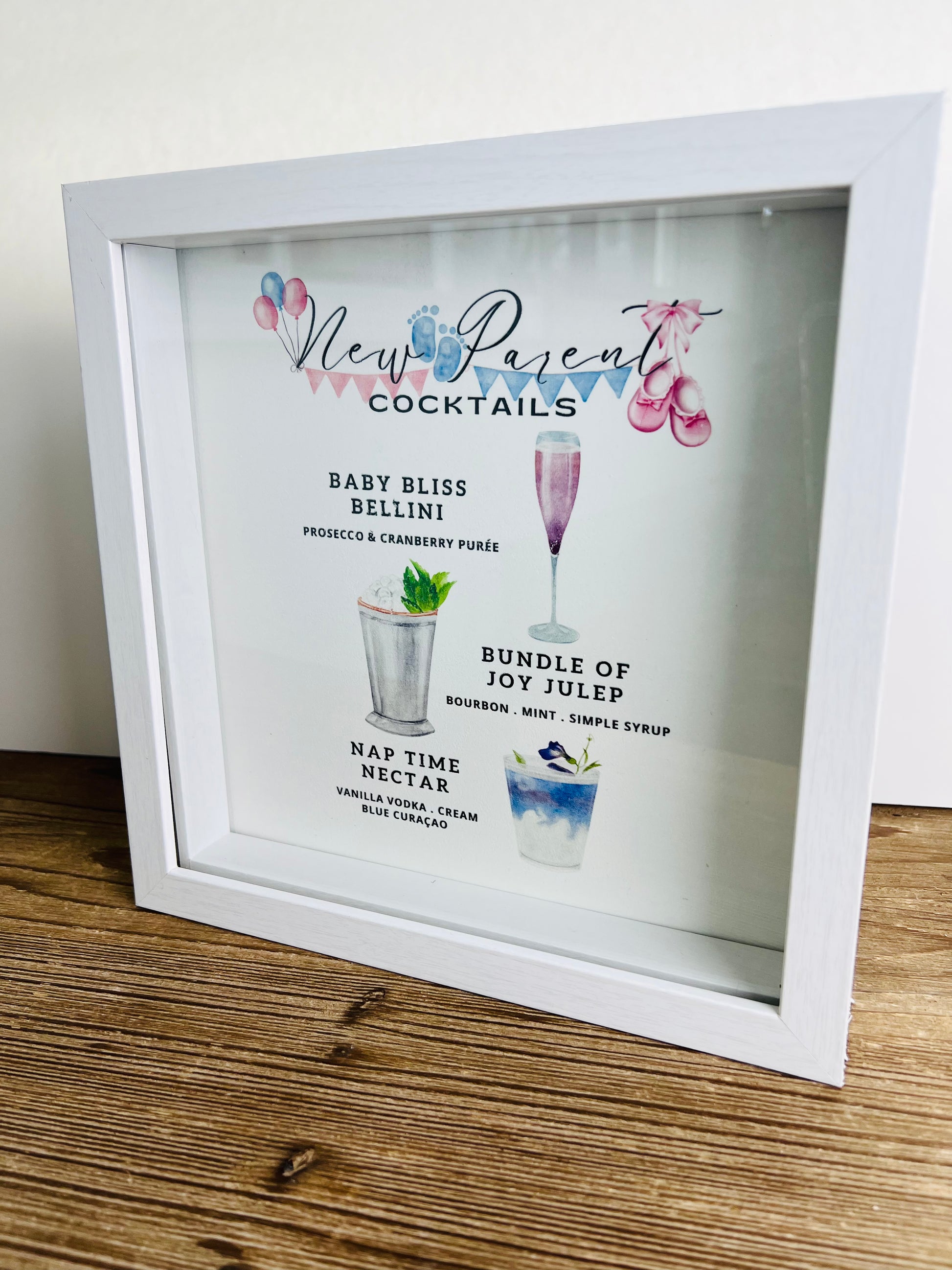 Boozy Boards are a cocktail menu for your home bar or kitchen. When guests come over and ask "What do you have to drink?" you have a pre-made Boozy Board prepared to show off your bartending skills and keep the bar stocked. Boozy Boards are a statement art and conversation piece that will wow your guests. Additionally, Boozy Boards make a unique gift that is personal to the person who has everything. Boozy Boards include the wood & glass shadowbox frame, and the cocktail menu shown.