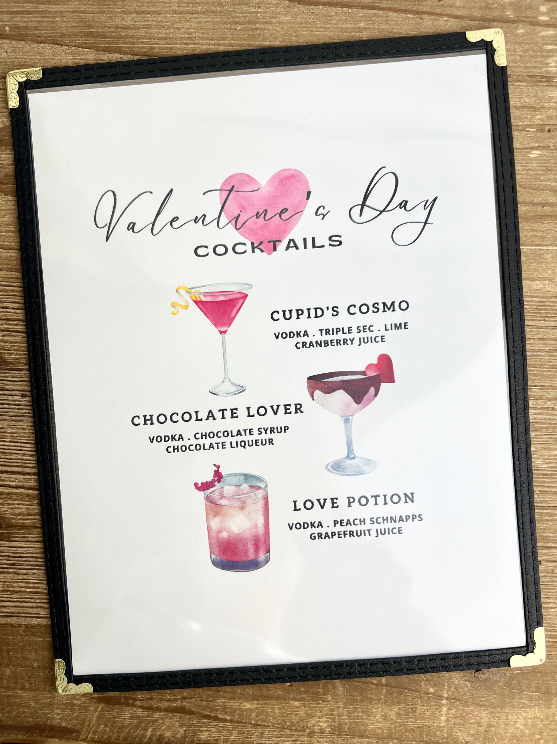 All bar menus are printed and developed in professional menu covers with decorative metal corners and faux-leather stitching.